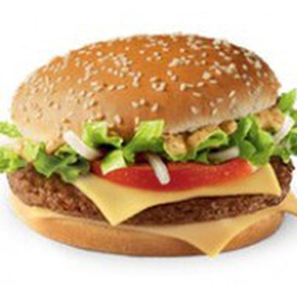 Состав: Бургер с рубленым бифштексом из 100% говядины на булочке с кунжутом, два кусочка сыра Эмменталь, свежий салат, лук, ломтик помидора и специальный соус с дымком